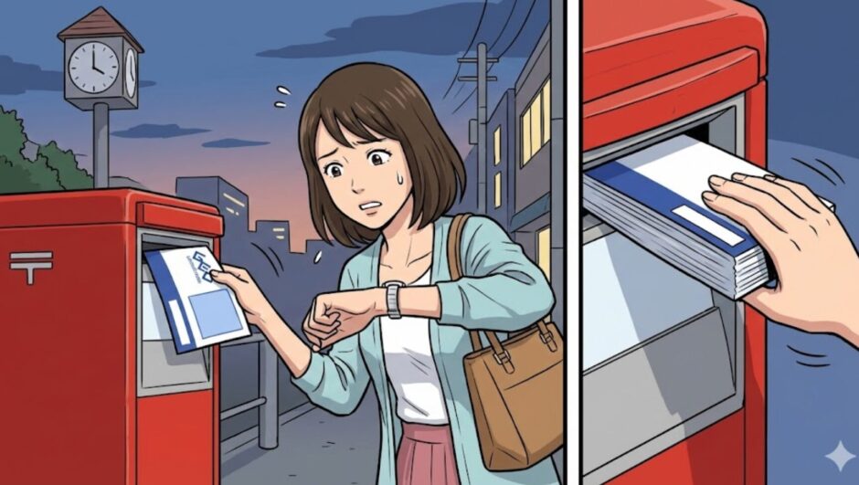 だいたい15時〜17時頃が多いのですが、もしこの時間を1分でも過ぎて投函すると、回収されるのは「翌日の朝」になってしまいます。つまり、ポストの中で丸一日眠ることになり、到着が1日遅れるのです。