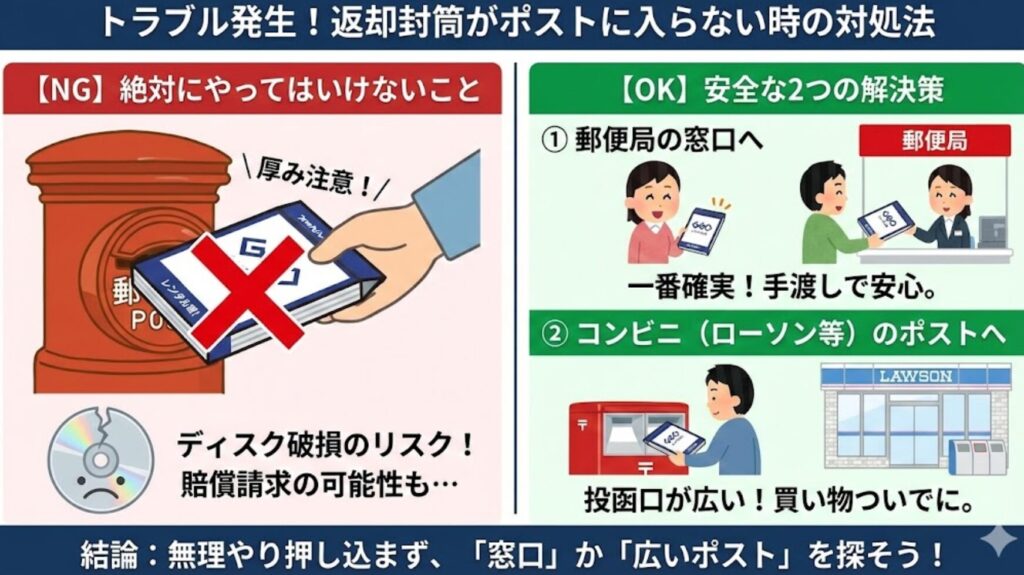見終わったらすぐに封筒に入れて、お散歩がてらポストへ出しに行きましょう。早めの返却こそが、トラブルなくレンタルライフを楽しむ一番のコツですよ♪