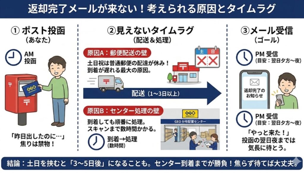 昨日出したのに、まだ『返却完了メール』が来ない…