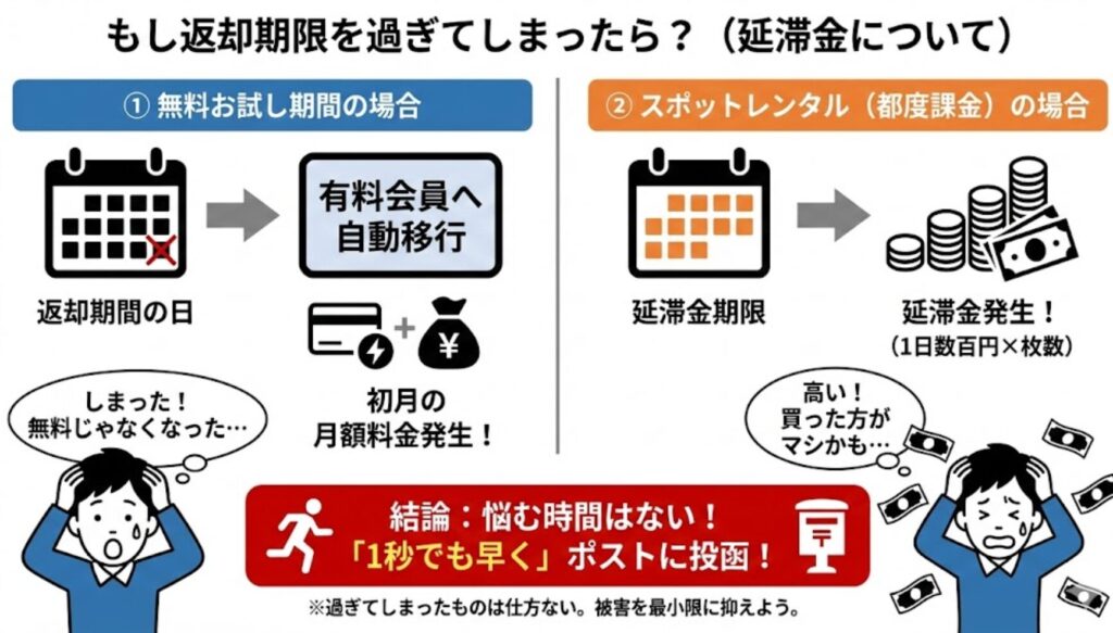 これを読まずにギリギリで投函すると、思わぬ延滞金(または月額課金)が発生してしまうかもしれません。そうなる前に、正しい「返却のルール」を押さえておきましょう!