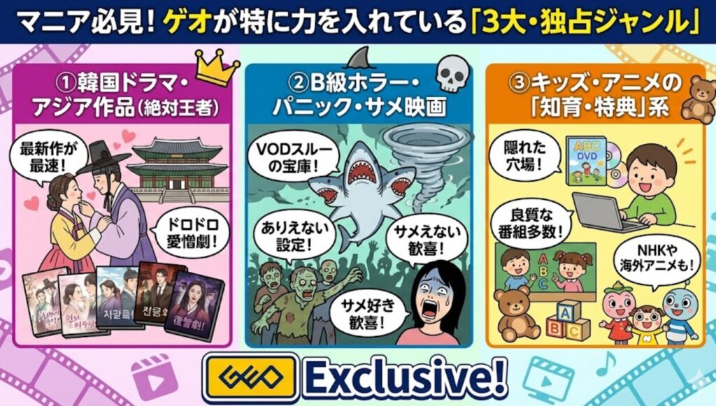 「検索方法はわかったけど、結局どれが面白いの?」 そんな方のために、ゲオが異常なほどの熱量(笑)でラインナップを強化している、3つのジャンルをご紹介します。