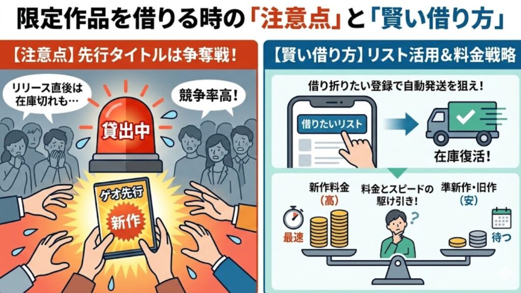 魅力的な限定タイトルですが、借りる前に少しだけ気をつけてほしいポイントがあります。