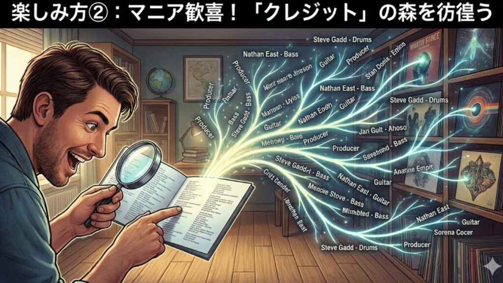 こうした「ミュージシャンの答え合わせ」ができるのは、詳細なクレジット表記があるCDならでは。 ここから、「じゃあスティーヴ・ガッドが叩いている他のアルバムも聴いてみよう」と、音楽の旅(ディグ)が広がっていくのです。