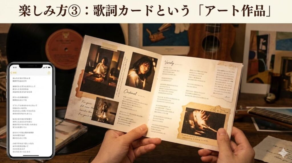 スマホの画面でスクロールする無機質な歌詞とは違い、紙の歌詞カードをめくりながら音楽を聴く体験は、アーティストの世界観にどっぷりと浸かる儀式のようなものです。