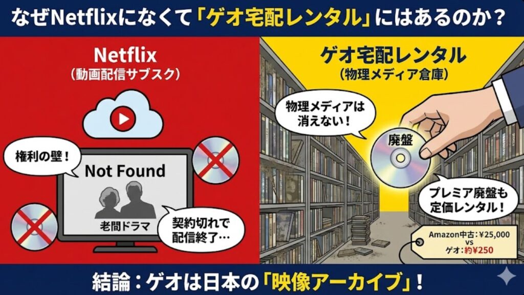 一方で、レンタルは「DVDというモノ」が存在する限り、半永久的に借りられます。 実はここだけの話、Amazonの中古市場で数万円のプレミアがついている「廃盤DVD」も、ゲオの倉庫には普通に在庫があったりします。