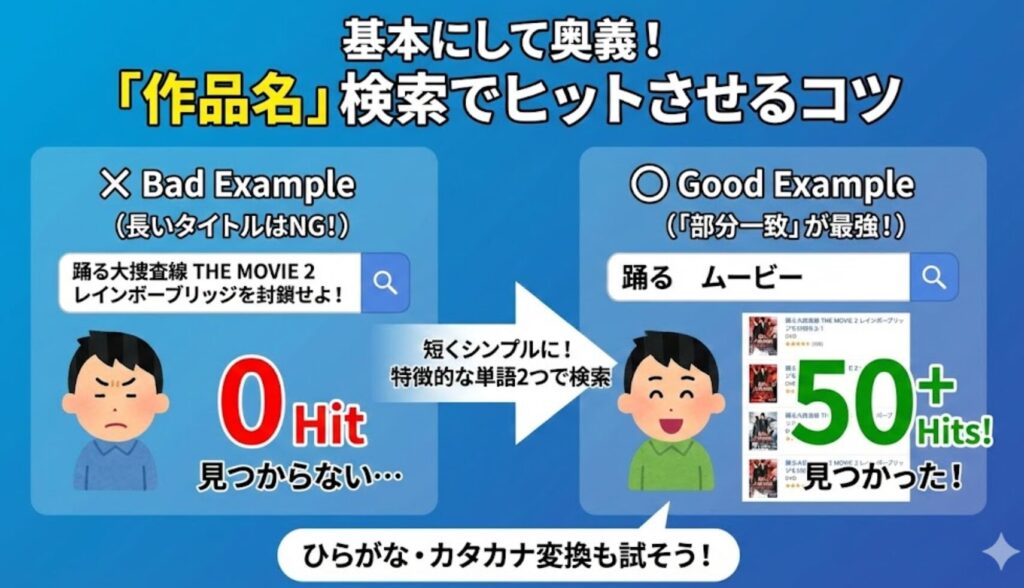 みなさん、真面目に正式名称を全部入力していませんか? 例えば『踊る大捜査線 THE MOVIE 2 レインボーブリッジを封鎖せよ!』を探すとき。 これを一字一句間違えずに入力するのは大変ですし、もし「!」が抜けていたり、スペースが半角全角違ったりするだけで「ヒットなし」になることがあります。