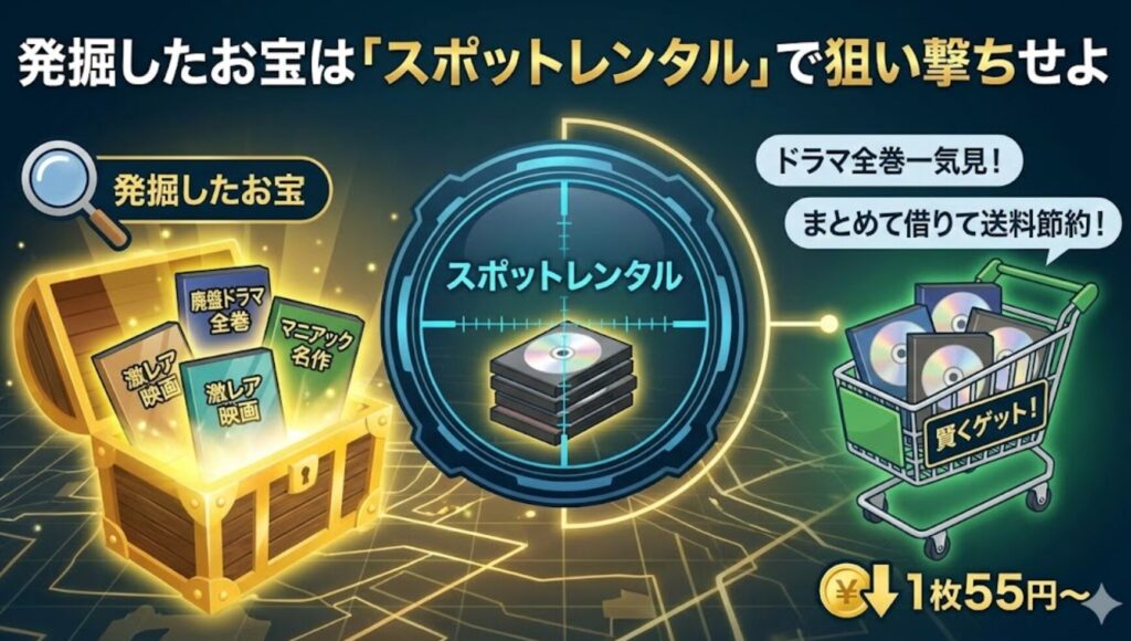 スポットレンタルは送料がかかりますが、最大枚数(20枚など)までなら送料は変わりません。 なので、見つけたレア映画はすぐに注文せず、「あとで借りるリスト(お気に入り)」に貯めておきましょう。 そして、ある程度たまったらまとめて発送! これが、送料を極限まで薄める賢い主婦(主夫)の知恵です。